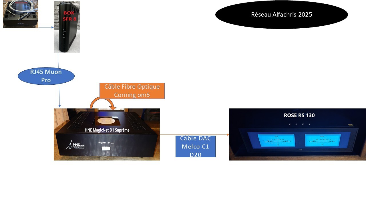 Box SFR8 alimentée par une alim HNE 12v, câble RJ45 Muon Pro jusqu'à l'entrée du switch HNE D1 , pont optique interne sur le HNE avec une fibre optique Corning OM5, câble DAC Melco C1-D20 entre la sortie SFP du HNE et l'entrée SFP du Rose...c'est la meilleure combinaison (chez moi...sur mon système)