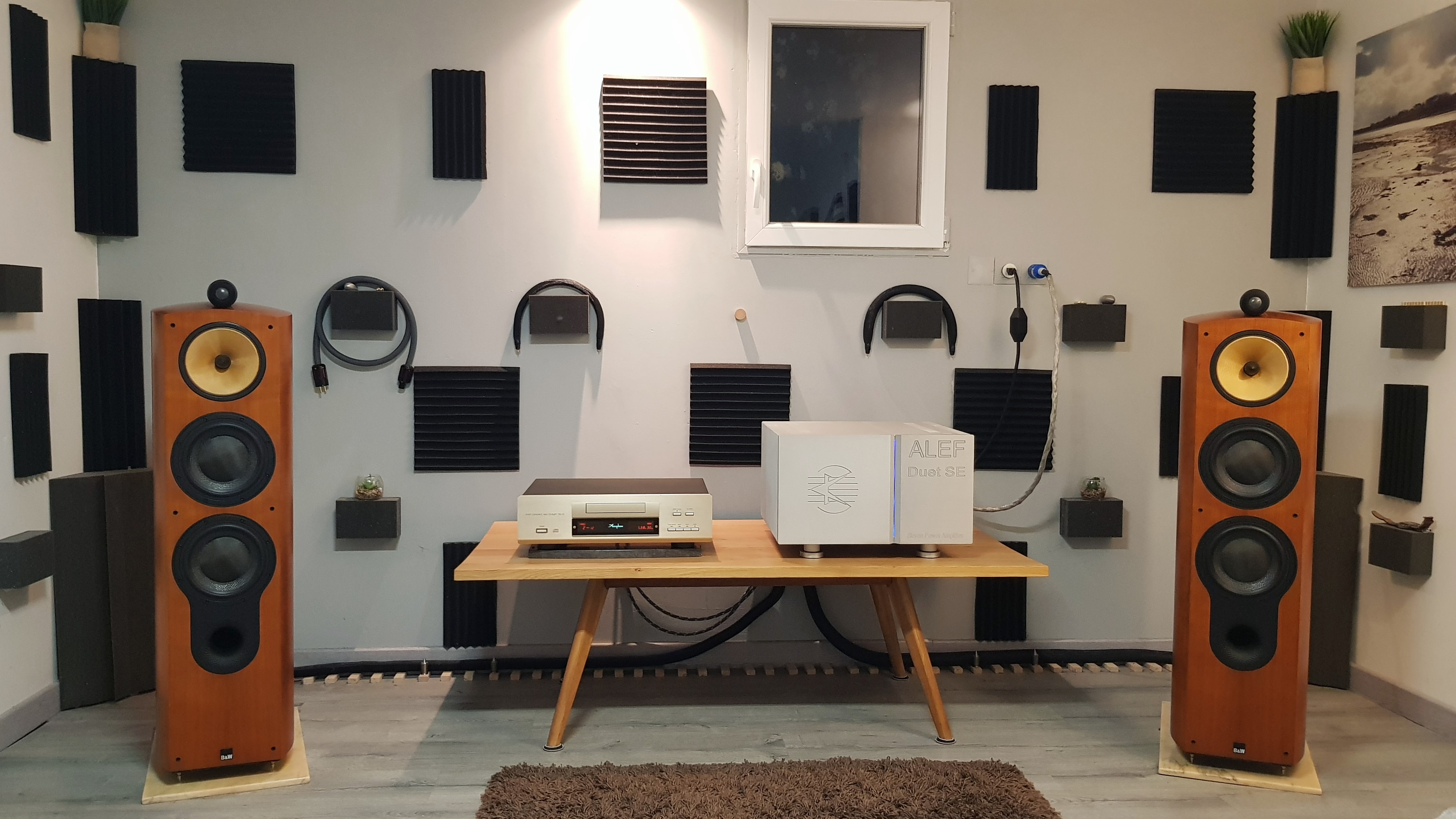 Je vois que tu as des basstraps mais je pense que tu devrais monter jusqu’au plafond pour que ce soit vraiment efficace et aussi bien diffuser entre les enceintes, sur les murs latéraux et éventuellement au plafond.