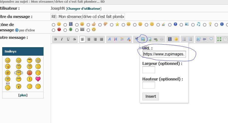 il faut d'abord faire héberger la photo chez un hébergeur (zupimages.net par exemple) et ensuite récuperer l'url crée pour la coller dans la case