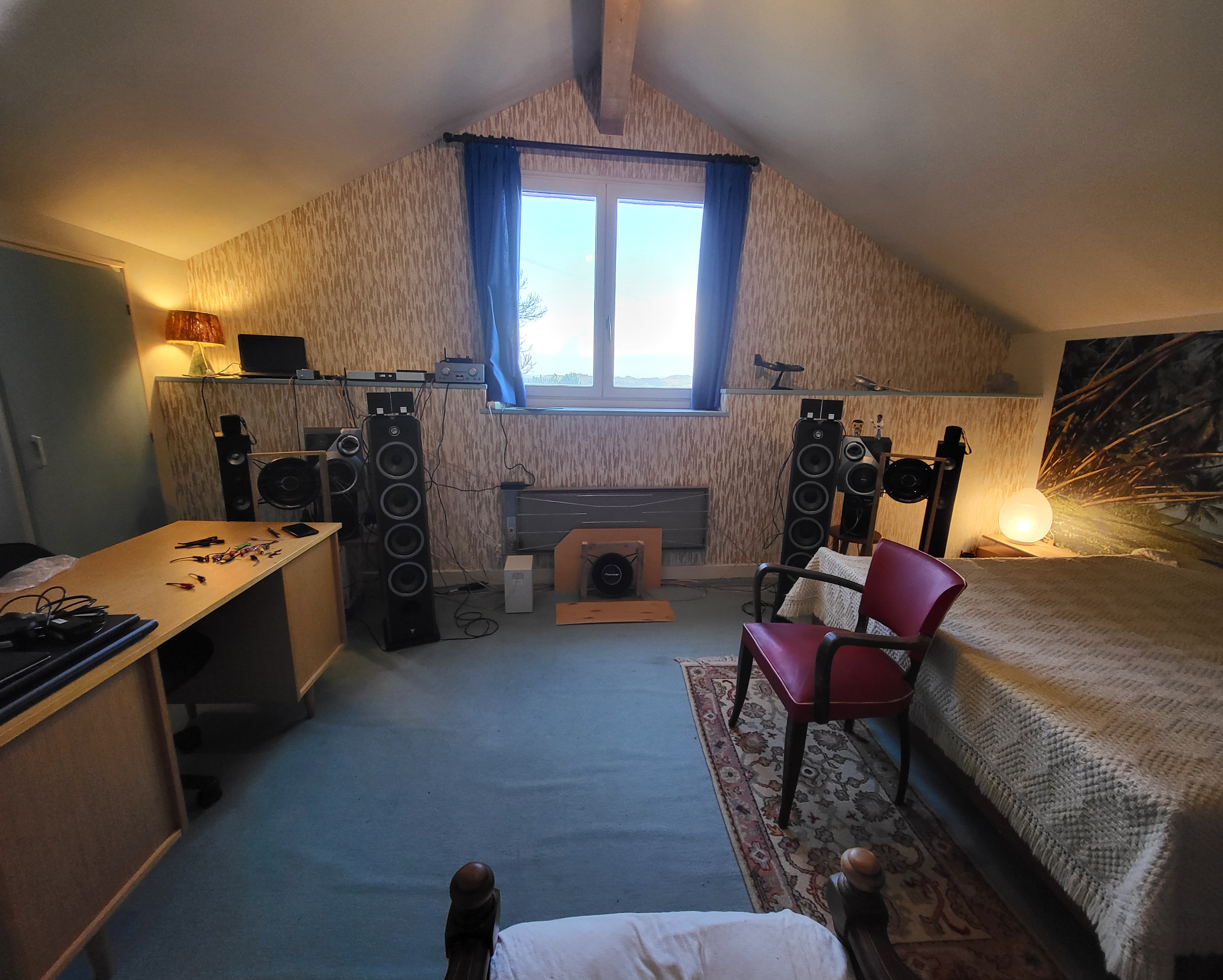 petite présentation de mon labo à la maison. La pièce, il y a presque 40 ans, était la chambre de mon frère. Elle est restée dans son jus "fin des années 80". Il n'y a pas deux surfaces parallèles (les pinailleurs pinailleront !), le sol est moquetté, c'est une pièce très amortie, la dynamique n'est pas son point fort, mais les détails s'entendent très bien.